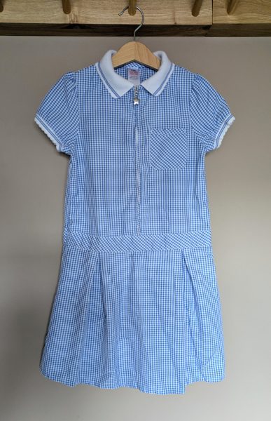 Description: Blue gingham F&F zip front summer dress. Three available – two with star zips and one with heart zip (please specify if you have a preference).