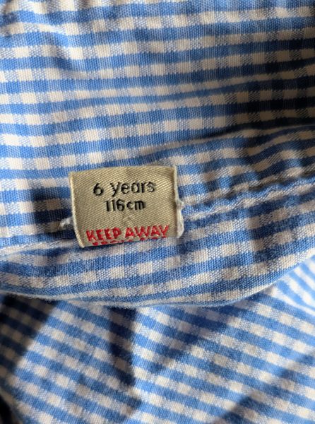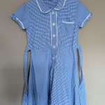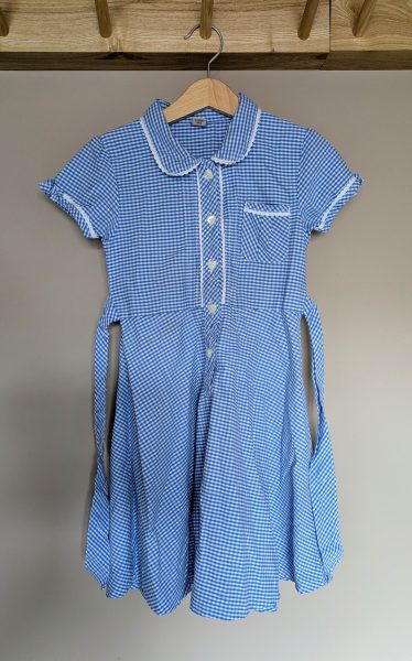 Description: Very cute blue button up summer dress with waist tie to fasten at the back. Slight stain on front – generally in good used condition.
