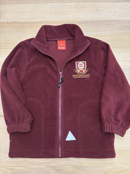 Description: School logo burgundy fleece. Zip fastening, pockets and elasticated cuffs. Good condition – no holes but bobbly. Could be fixed with a de-bobbling gadget.