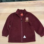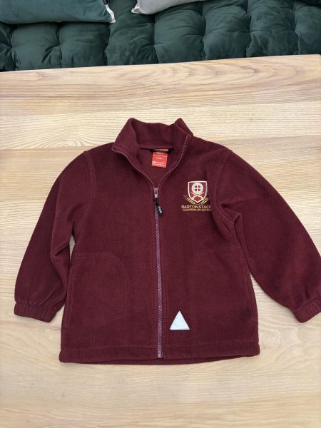 Description: School logo burgundy fleece. Zip fastening, pockets and elasticated cuffs. Great condition.