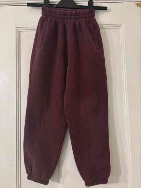 Description: Pair of burgundy jogging bottoms. Pockets. Elasticated waist and ankles. Fabric bobbling a little from wear.