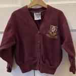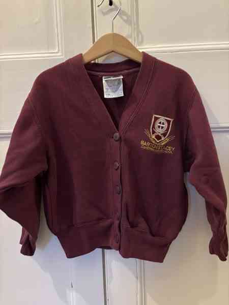 Description: Burgundy school cardigan with embroided Barton Stacey school logo. Button fastening, including spare button and pockets. Great condition. Slight sticker mark in label.