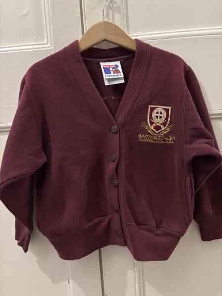 Description: Burgundy school cardigan with embroidered Barton Stacey school logo. Button fastening , including spare button and pockets. Great condition.