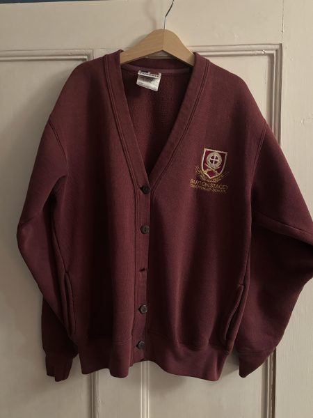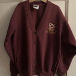 Description: School burgundy cardigan. Button fastening and pockets. One button missing and no spare.
