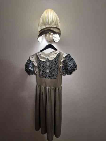 Description: blue and grey shortsleeve dress, hat