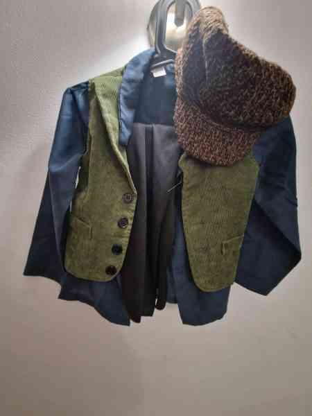 Description: long sleeve beige shirt, belt, cap, satchel