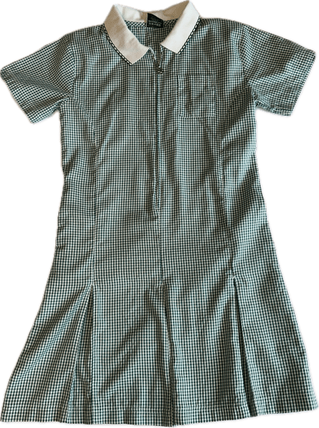Description: Gingham School Dress by Zeco – Zipped Front with top pocket and pleated skirt dettail. Collar is white and ribbed with stitch detail. ( Has name on label but this can be covered with your own name insert) Code GD09