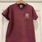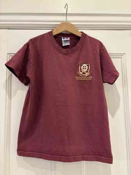 Description: Round neck burgundy school PE t-shirt with embroidered Barton Stacey school logo. Good condition overall although very small hole by school emblem (as shown in picture). Could be stitched up.