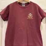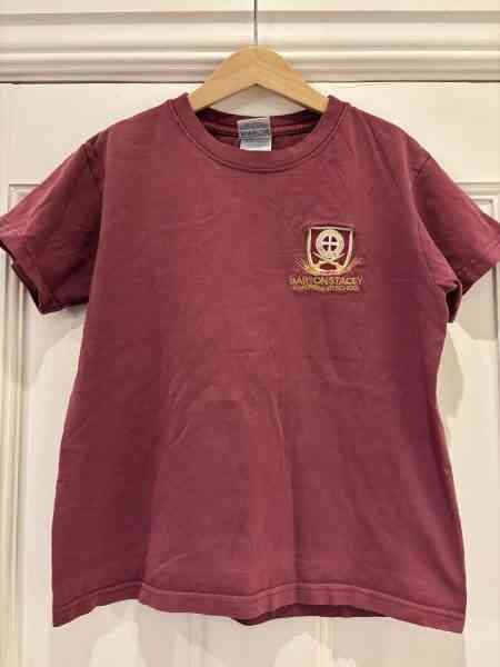 Description: Round neck burgundy school PE t-shirt with embroidered Barton Stacey school logo. Good condition overall except two small holes either side of school emblem (as shown in photos), but could be stitched up.