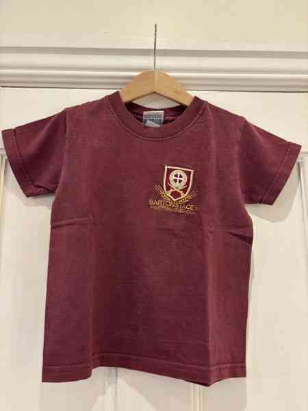 Description: Round neck burgundy school PE t-shirt with embroidered Barton Stacey school logo. Great condition.