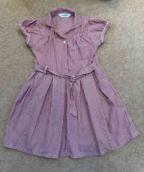 Description: Red gingham dress with button front and belt at front. Breast pocket. Age 5-6 years. Good condition. Two available. Can be bought separately £1 each.