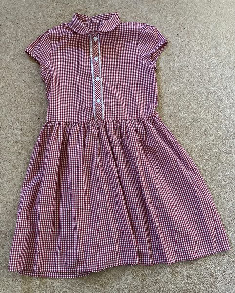 Description: Red gingham dress with button front and belt at back. Age 9-10 years.