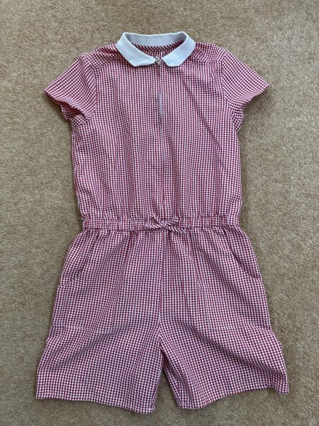 Description: All-in-one red gingham playsuit with zip front and two side pockets. Good condition. Age 10-11 years