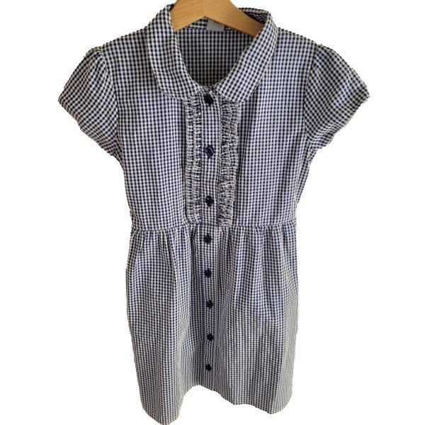 Description: Summer dress in Navy / Dark Blue Gingham fabric with button fastenings to the front. Age 5-6. These dresses are in good condition or better. There may be some colour fading, bobbling or previous names. Photos are for illustration purposes only. The styles and brands will vary. If you are not satisfied with the item you receive, please contact us within 7 days of collection..