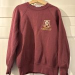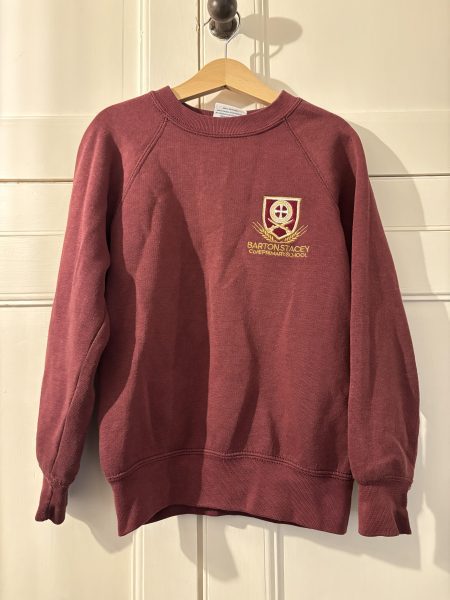 Description: Round neck burgundy school jumper with embroidered Barton Stacey school logo. Good condition – some bobbling to material and tiny hole on arm as shown in photo.