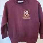 Description: Round neck burgundy school jumper with embroidered Barton Stacey school logo. Fair condition with slight bobbling from washing (as standard with this type of material), stitching on cuffs starting to fail (but could be stitched) and small hole to front.