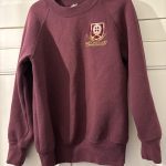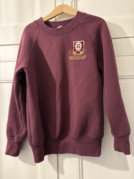 Description: Round neck burgundy school jumpers with embroidered Barton Stacey school logo. These pre loved items show signs of wear such a bobbling or minimal colour change from washing however also have some minor damage eg. A Small hole, small section of loose stitching, small hole in cuff or fraying to logo (as shown in photo) however either fixable or not noticeable. Good for back up/spare. Photo just an example.